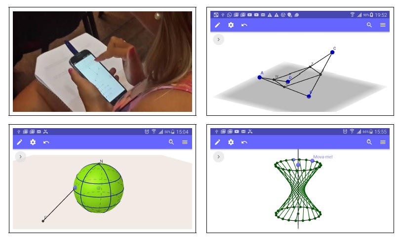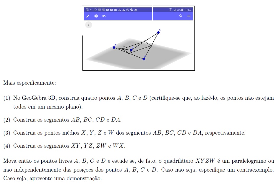 Estudos apontam que, em Geometria, alunos da escola básica frequentemente confundem propriedades do desenho com propriedades do objeto geométrico representado (Gravina,2006). Assim, por exemplo, um quadrado girado deixa de ser um quadrado para esses alunos. Possivelmente, este tipo de comportamento seja o reflexo da natureza estática de como a Geometria é comumente trabalhada em sala de aula. Neste trabalho, a proposta é desenvolver atividades que incentivem os alunos a realizar a construção de um problema no celular ou tablet com a utilização do software GeoGebra. Os alunos devem procurar movimentar a construção na busca por pontos livres, semi-livres e fixos. Além disso, pode-se criar suas próprias conjecturas e testar hipóteses. Uma vez que o invariante geométrico da construção foi identificado, então é preciso fazer uma demonstração formal matemática do invariante encontrado.